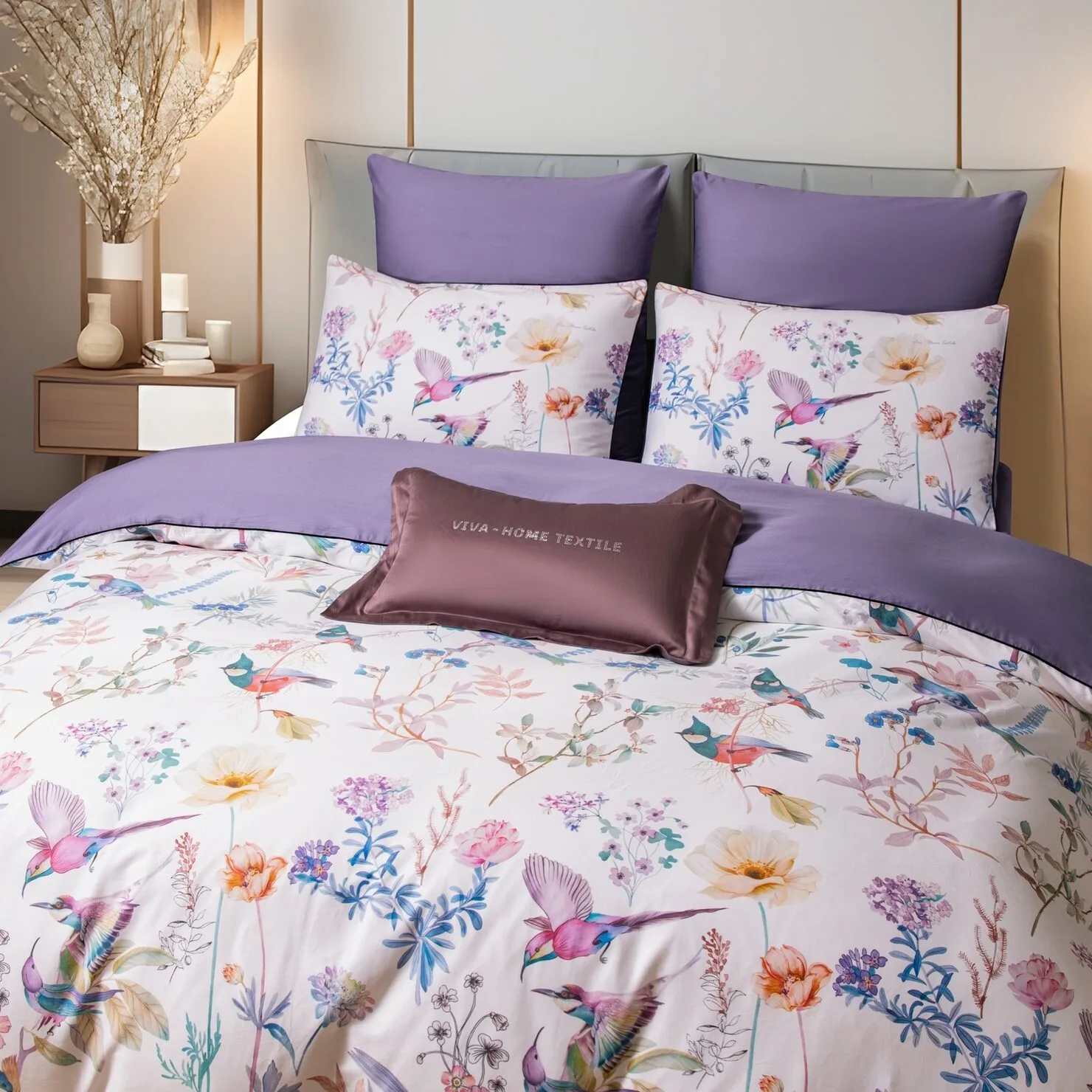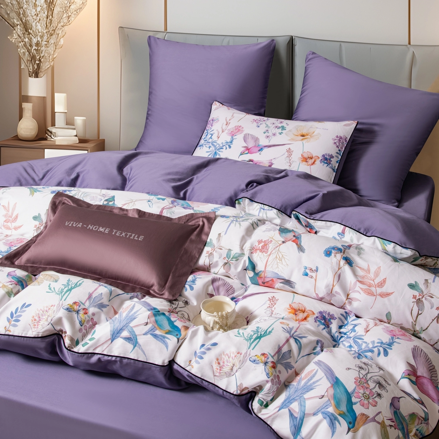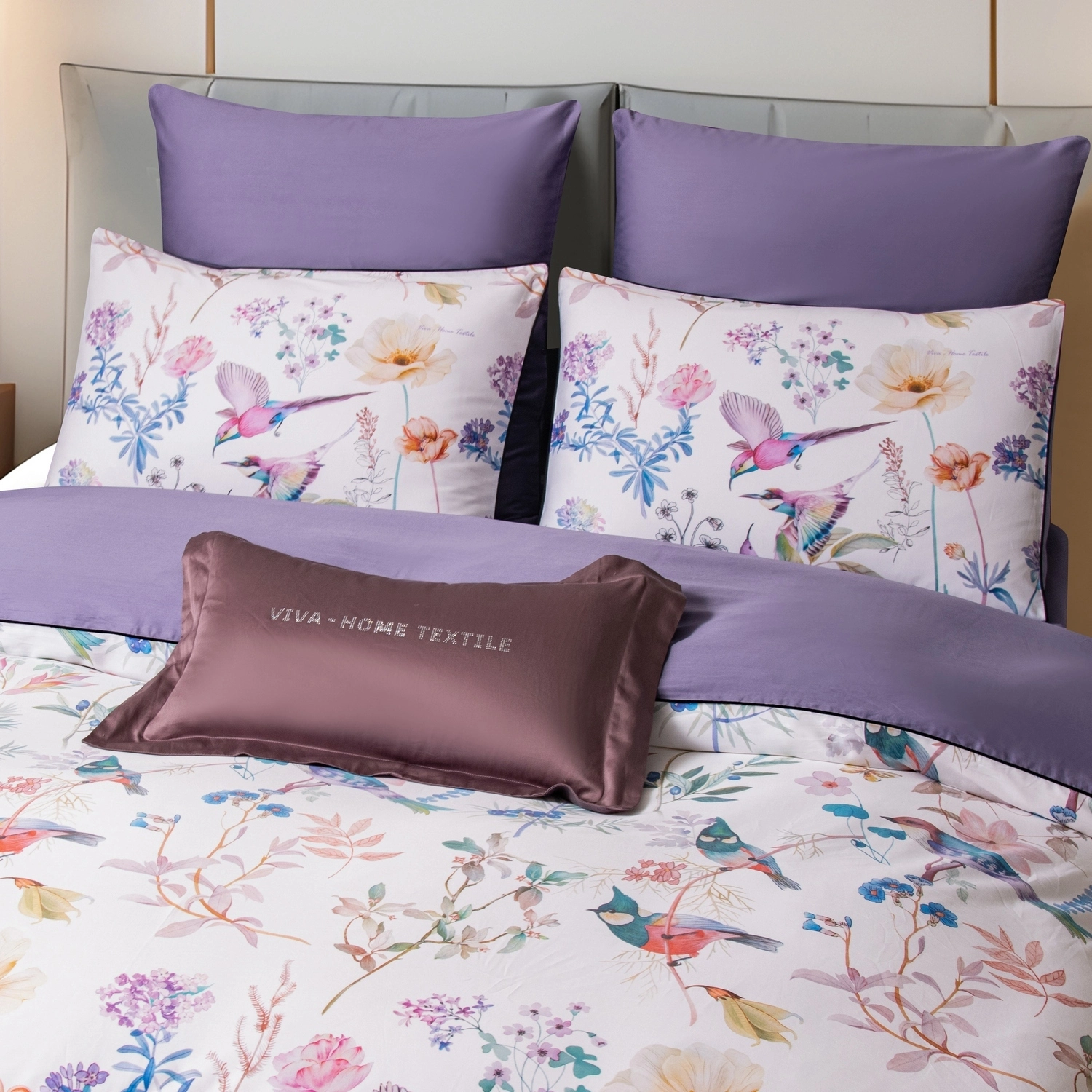 Ткань компаньон: Наволочки 50*70 с разных сторон разной расцветки, наволочки 70*70 однотонные в цвет простыни, пододеяльник с разных сторон разного цвета, простыня однотонная такого же цвета, как низ пододеяльника.