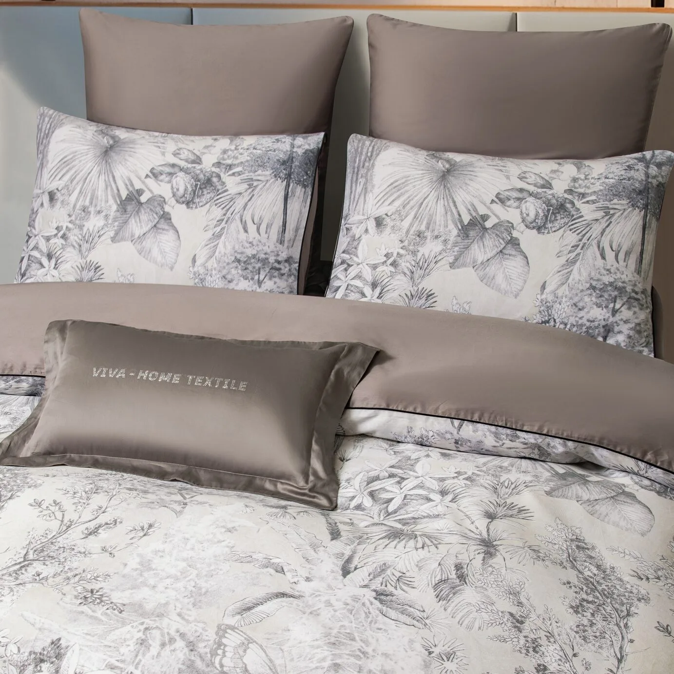Ткань компаньон: Наволочки 50*70 с разных сторон разной расцветки, наволочки 70*70 однотонные в цвет простыни, пододеяльник с разных сторон разного цвета, простыня однотонная такого же цвета, как низ пододеяльника.
