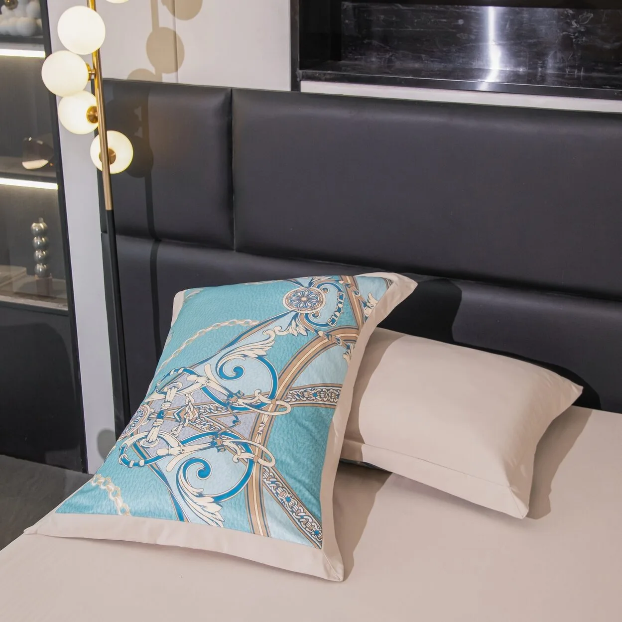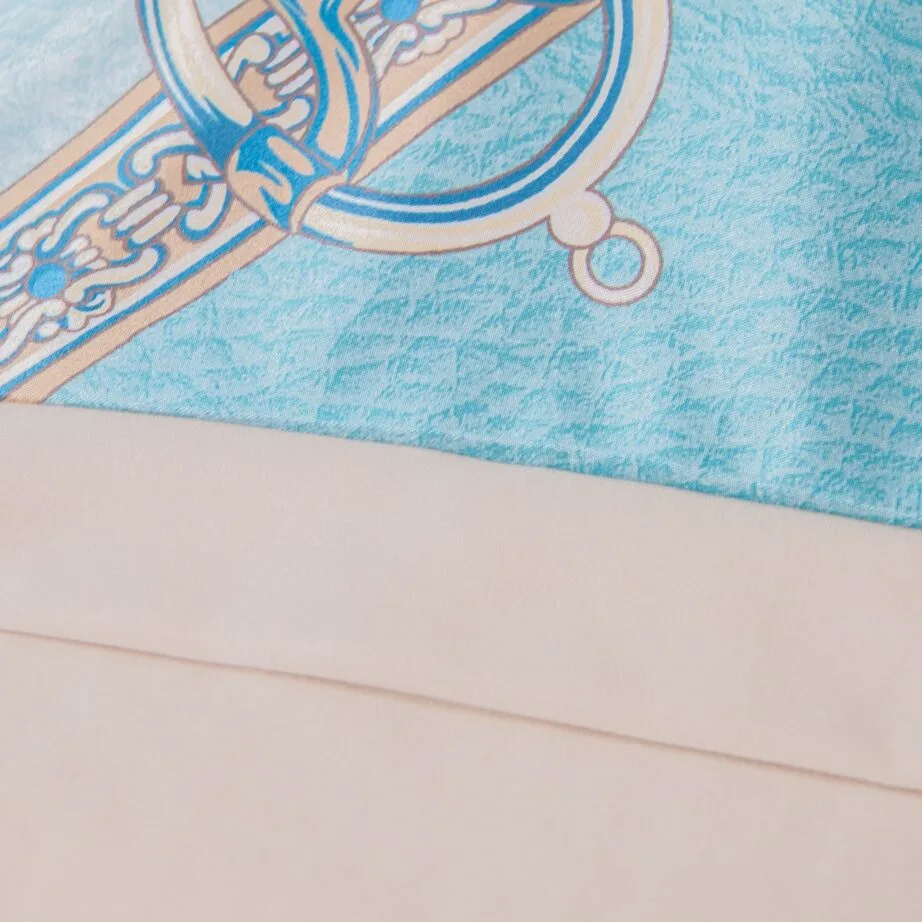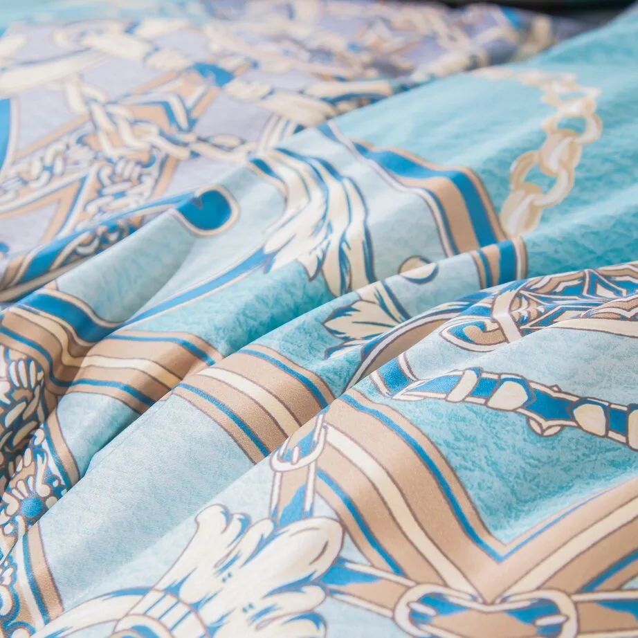 Ткань компаньон: Верх пододеяльника - мерсеризованный сатин, низ пододеяльника - сатин. Наволочки 50*70 см и 70*70 см с разных сторон разной расцветки. Пододеяльник с разных сторон разного цвета. Простыня однотонная такого же цвета, как низ пододеяльника.